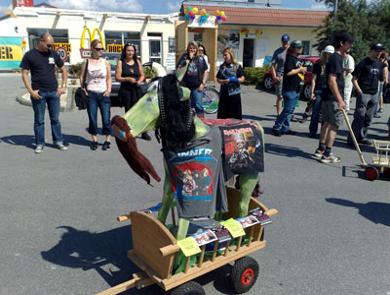 Bier, Metal und Metal-Fans – damit lässt sich ja schon etwas anfangen. Doch jeder war gespannt, wo denn die Verbindung zur Viehscheid versteckt war. Diese Verbindung ließ dann auch nicht mehr lange auf sich warten, und zum allgemeinen Jubel wurde ein Anhänger geöffnet, aus dem dann das Maskottchen der Metal-Viehscheid g