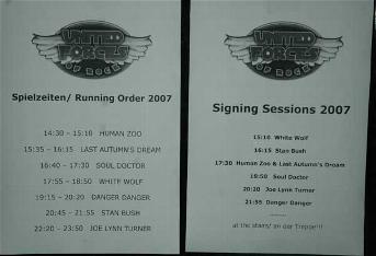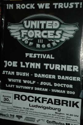 Ex-Malmsteen/Deep Purple/Rainbow-Sänger Joe Lynn Turner fällt dabei verdientermaßen die Headliner-Rolle zu - und überzeugt mit einem Programm, das im Wesentlichen aus Rainbow- und Deep-Purple-Gassenhauern besteht. Einzig die beiden Zugaben ‘Highway Star’ und ‘Burn’ sorgen für Verwunderung, sind dies doch klassische Ian-Gillan- beziehungsweise David-Coverdale-Nummern – Turner dürfte diese Evergreens höchstens mal 1990 während seines SLAVES-AND-MASTERS-Intermezzos bei den Purpurnen in die Kehle gekriegt haben … Ach ja, der Auftritt des Amerikaners wäre beinahe ins Wasser gefallen: Da ihm während der Autogrammstunde jemand offensichtlich seine Lieblingsjacke entwendete, wollte der kleine Mann mit der großen Stimme erst auftreten, wenn sich diese wieder angefindet. Zum Glück hatte Turner ein Einsehen – die Absage der Show würde in erster Linie seine anwesenden 700 Fans treffen, nicht das eine Stoffwechselendproduktausscheidungsorgan, das sich zu diesem Diebstahl berufen fühlte.