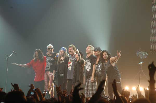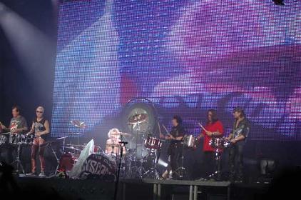 Auch später, nach ‘In Trance’, übernimmt Roth noch einmal die Leadvocals – beim Titelsong des 1974 erschienenen Zweitlings FLY TO THE RAINBOW, der sich seit langem wieder einmal im Set der Scorps befindet! Und wieder eine rhetorische Frage Meines: „Strasbourg – are you ready to rooock???“ Klaro! Strasbourg rockt zu ‘321’ nach allen Regeln der Kunst – und (O-Ton Meine): „Strasbourg – you’re Dyn-a-miiite!!!“ Hier kann sich naturgemäß Kottak geradezu ideal an einem Schlagzeugsolo beweisen – schließlich gesellen sich zum US-Trommler auch noch einmal so ziemlich alle aktuellen und Ex-Band-Mitglieder, um mit vereinten Percussion-Kräften die bandinterne Familienzusammenführung optisch wie akustisch zu besiegeln. Rarebell übernimmt schließlich noch einmal für ‘Blackout’ die Schießbude (an der er diesmal eine gute Figur abgibt – kein Vergleich zum „betreuten Drumming” der W:O:A-Show 2006). ‘Big City Nights’ – flankiert von ent- sprechenden Videoeinspielungen - rundet ein offizielles Programm ab, das kaum Wünsche übrig lässt.