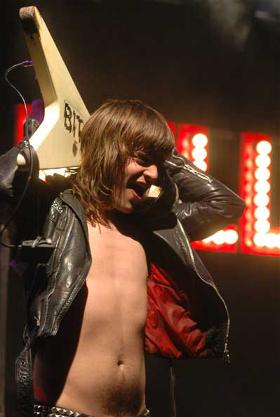 nackten Oberkörper, Flying V, Gitarrenballett und ein Spagat, bis fast