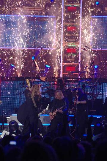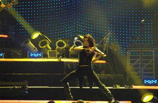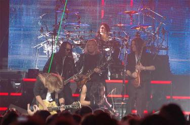 Gespielt wird selbstredend – wie hier auf der New York gegenüber liegenden Seite in New Jersey – in größeren Hallen. Die Izod Arena ist auch heute, Samstagabend, wie gestern fast bis auf den letzten Platz mit 12.000 Zuschauern gefüllt – am zweiten Abend hintereinander. Was dann folgt, lässt sich mit Worten schwer beschreiben. Alleine das Backdrop besteht über die gesamte Bühnenbreite und -höhe aus einem riesigen LED-Schirm – die zahlreichen, in bis zu vier Ebenen angeordneten, beweglichen Lichttraversen sind ebenfalls mit LED-Schirmen verkleidet, die ständig mit adäquaten Bildern die jeweils gespielten Songs optisch unterstreichen. Rechts, links und in der Mitte befinden sich Hydraulikplattformen, die die beiden Gitarristen (Chris Caffery, Alex Skolnick) und Teufelsgeigerin Anna Phoebe exzessiv nutzen – Drummer Jeff Plate hingegen muss sich auf seiner Plattform vorkommen, als würde er in einem Fahrstuhl trommeln, während Johnny Lee Middleton in guter alter Basser-Tradition Bodenhaftung wahrt und souverän für die tiefen Töne sorgt.